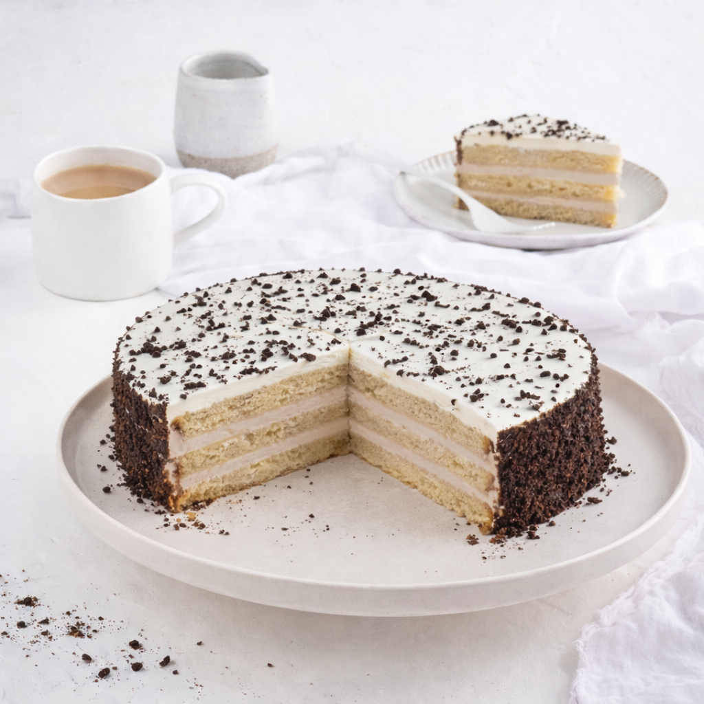 A moist, tender banana cake layered with luscious caramel and banana cheesecake, finished with a silky crème glaze and a generous coating of grated chocolate for a rich, indulgent finish